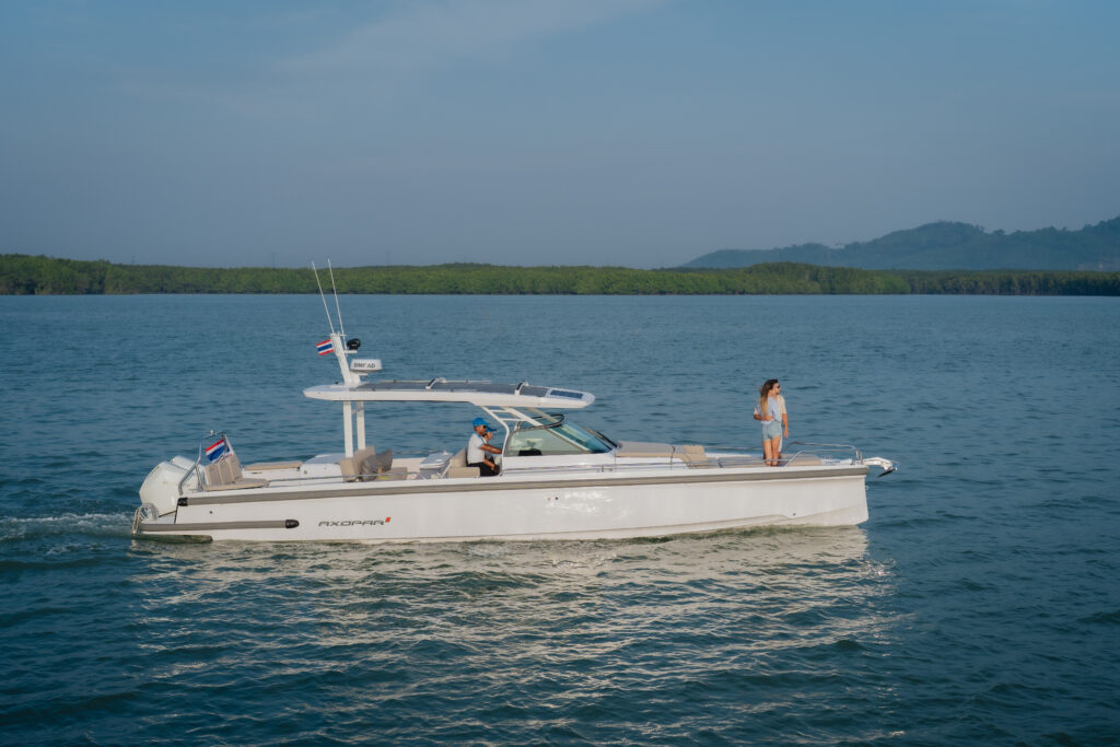 Experience the pinnacle of maritime luxury with a brand-new Axopar 37 crafted in 2023, ideal for exploring the pristine waters of Phuket. With a length of 11.5 meters and a beam of 3.3 meters, these striking vessel provides a seamless blend of style, comfort, and performance. Accommodating up to 6 guests, the Axopar 37 features comfy seating, inviting you to unwind and enjoy the breathtaking surroundings. With plenty of storage to keep your stuff safe, and a bathroom for convenience, your boat journey gets an extra boost of comfort.