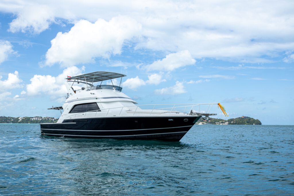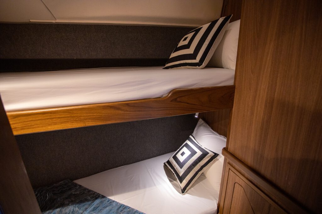 Bertram boat with newly refurbished interior with a focus on fishing and comfort. Bertram is a well-known brand for sportfishing boats, and having three cabins and air conditioning onboard suggests that it's geared towards providing a comfortable and enjoyable experience for its passengers.