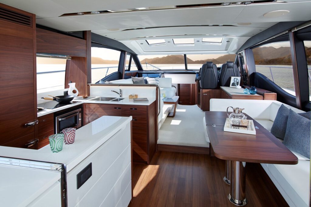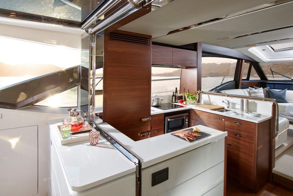 The beautifully appointed galley aft of the saloon, with an open-plan dining area opposite, has sliding doors and a fully opening electric window which leads out to the cockpit creating an al-fresco bar.