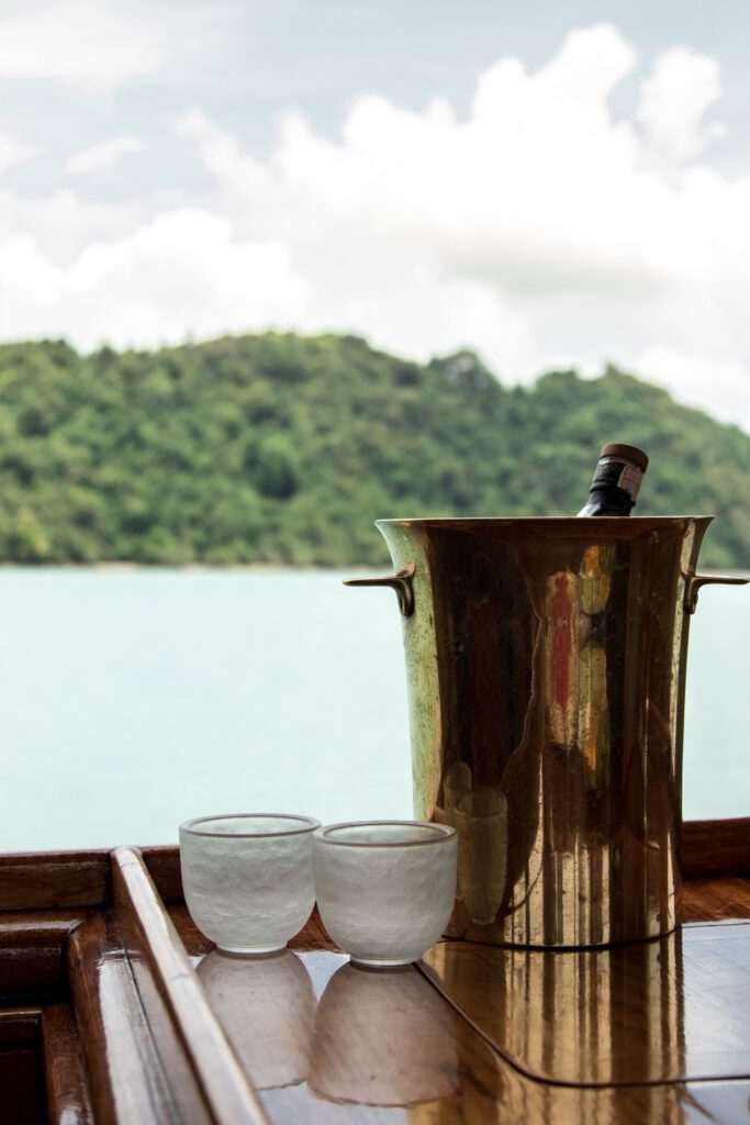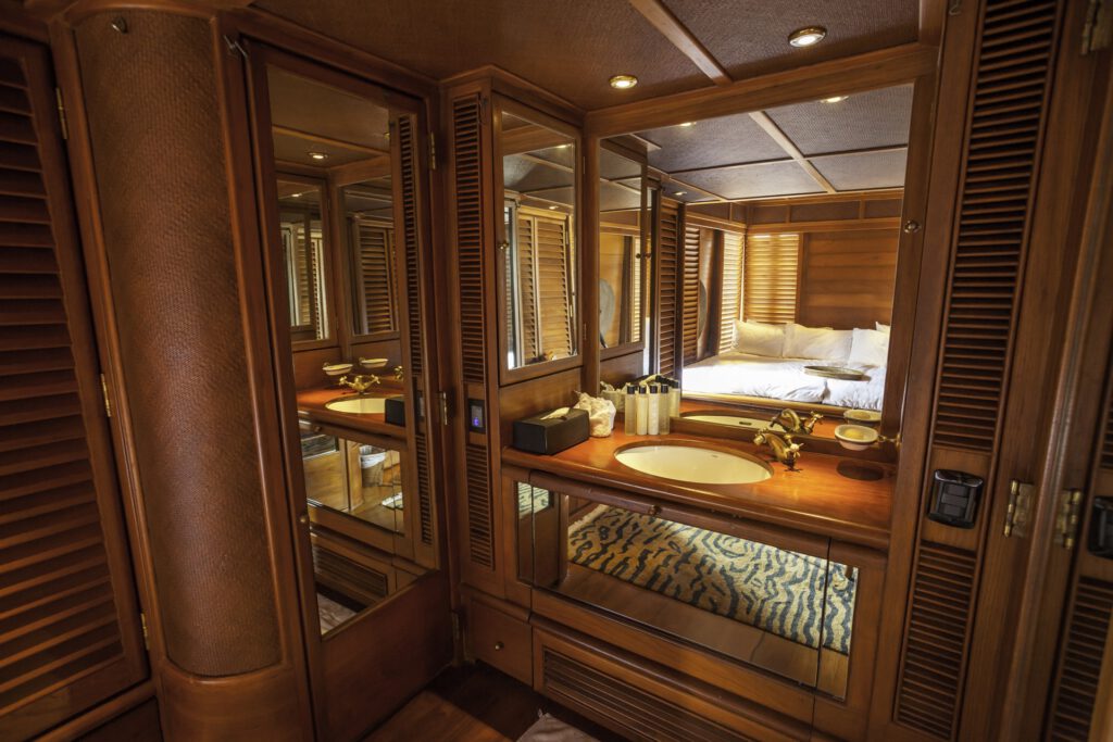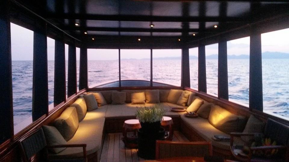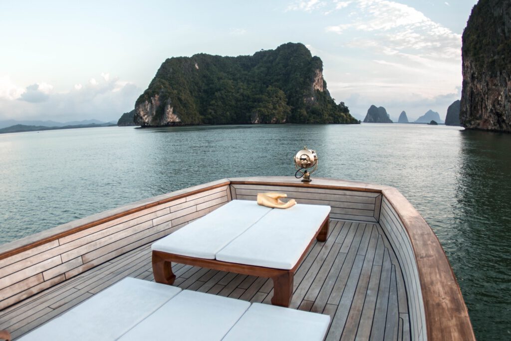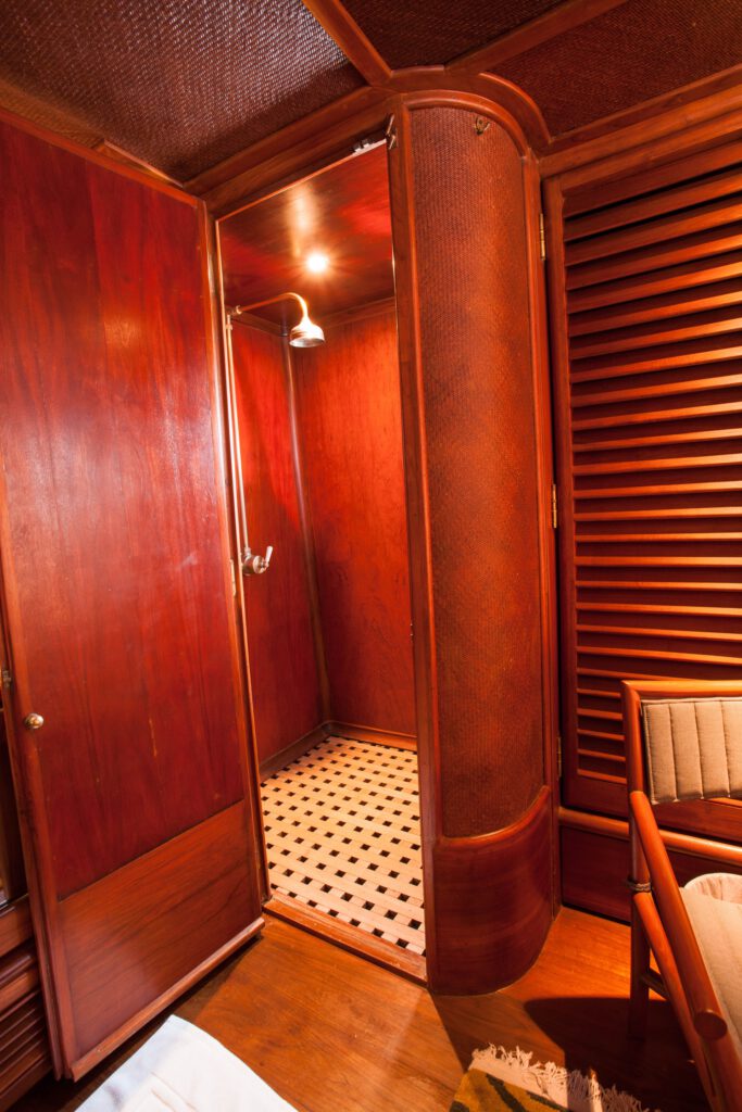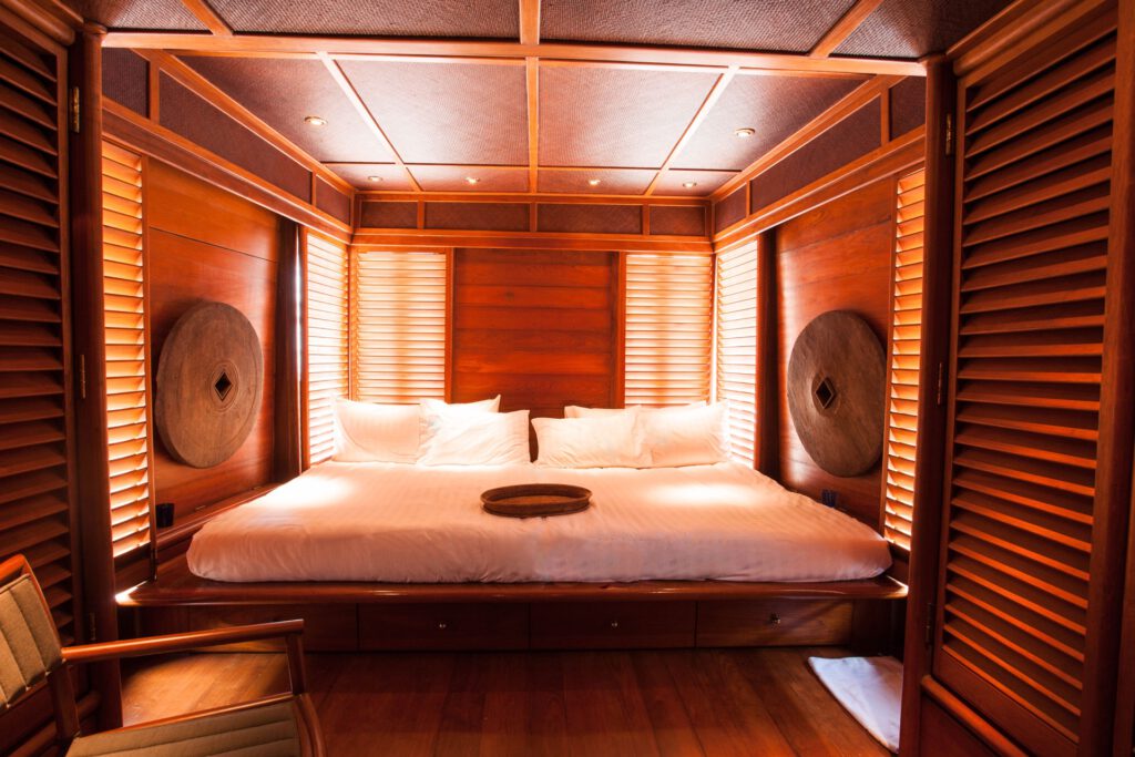 An Asian gone by era atmosphere on board with a dedicated and kind asian crew to take care of your every wish aboard. Her interior is mostly a neutral palate with accents provided by authentic Southeast Asian antiques from the 18th Century. Seamlessly, the ancient and modern interact in the saloon where bespoke designed louvered cabinet hides sound systems and glassware and the staterooms are adorned with tiger-patterned rugs.