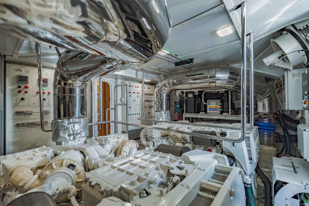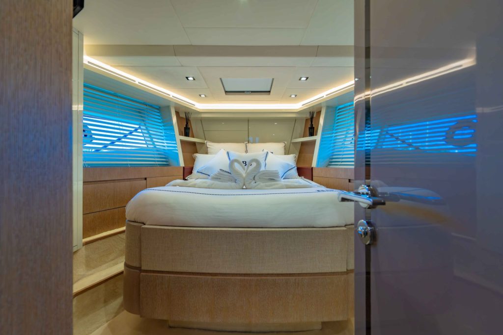 The unique layout comprises four cabins with three ensuites, as well as a crew cabin with two berths and its own bathroom, enabling the yacht to comfortably accommodate ten. An exclusive companionway affords separate access to the master cabin, ensuring absolute privacy and serenity.