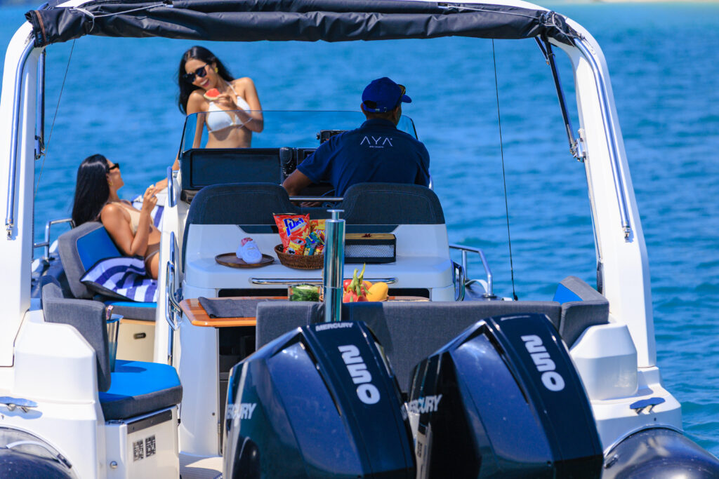 Perfect for long trips on the sea. A true private oasis thanks to its transformable surface. Transformed into a sunbathing area. Rigid-hulled inflatable openly oriented towards leisure