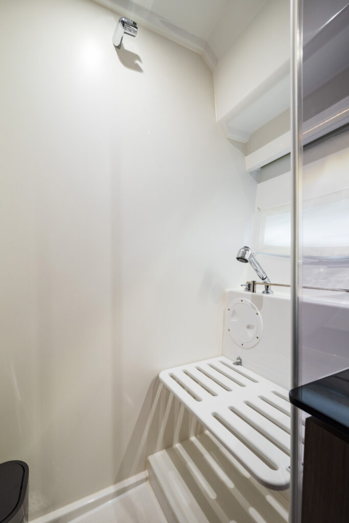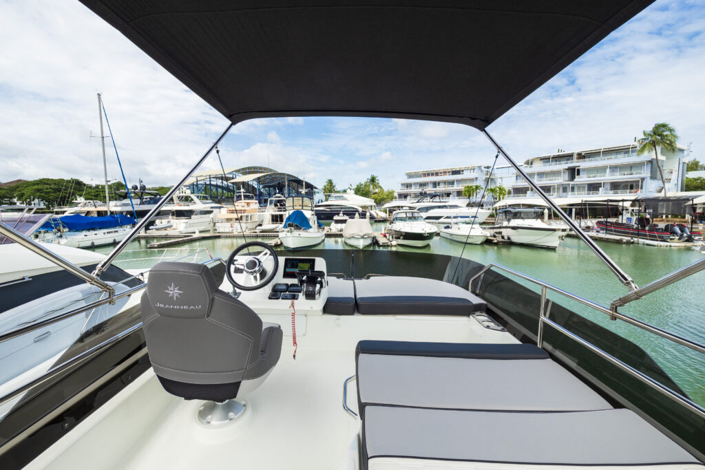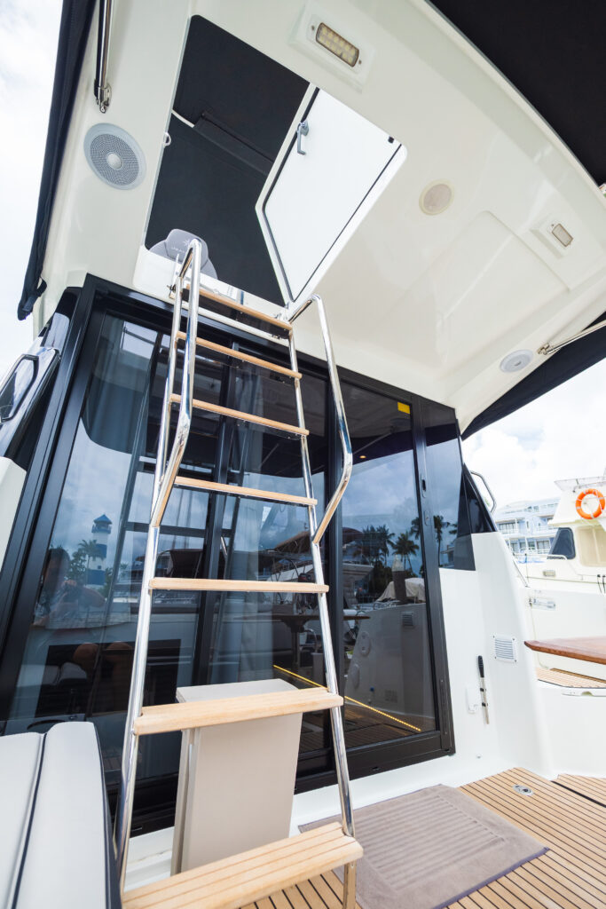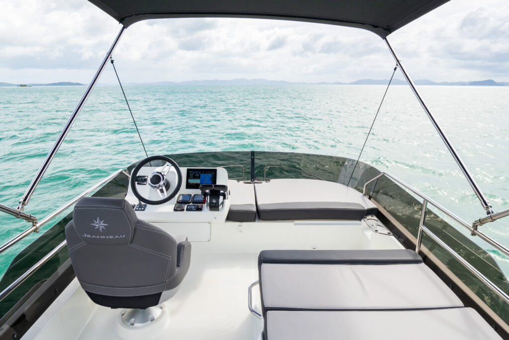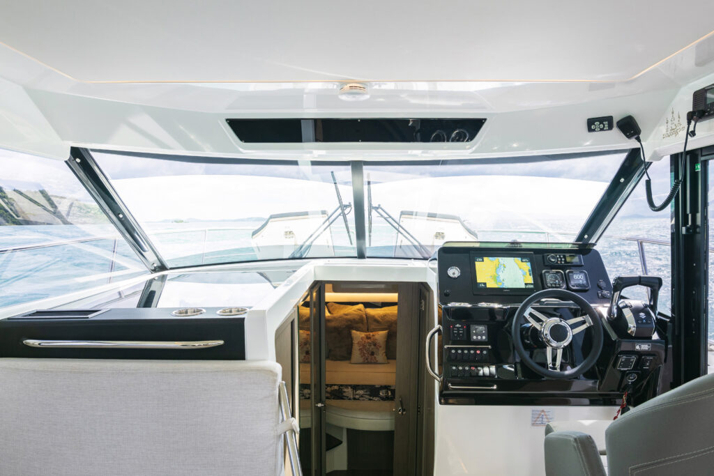Effortless Access: Features recessed side decks, a starboard sliding helm door, and an opening coaming gate for safe movement at sea.