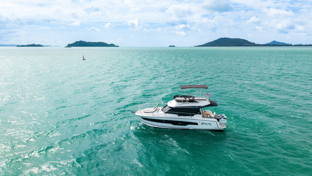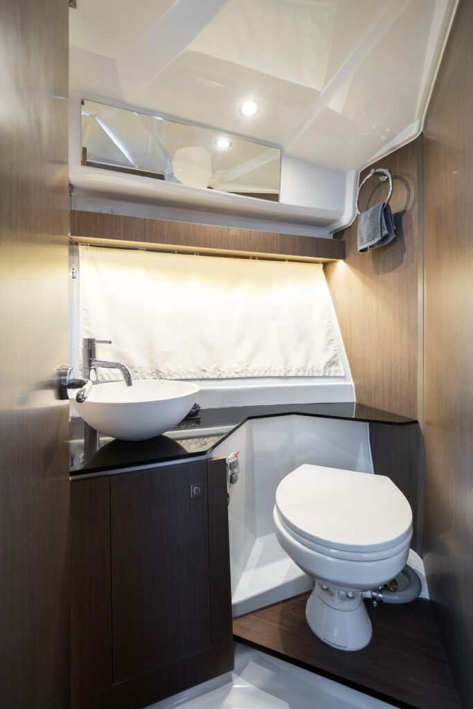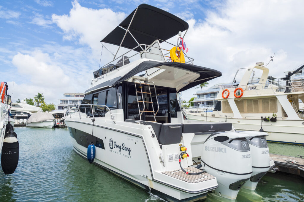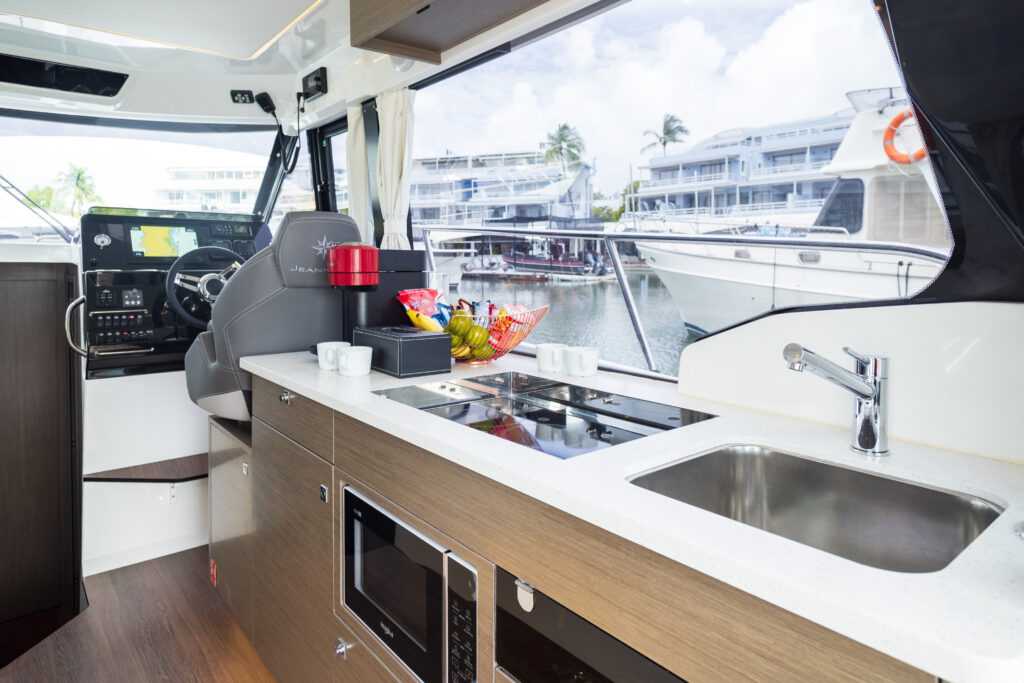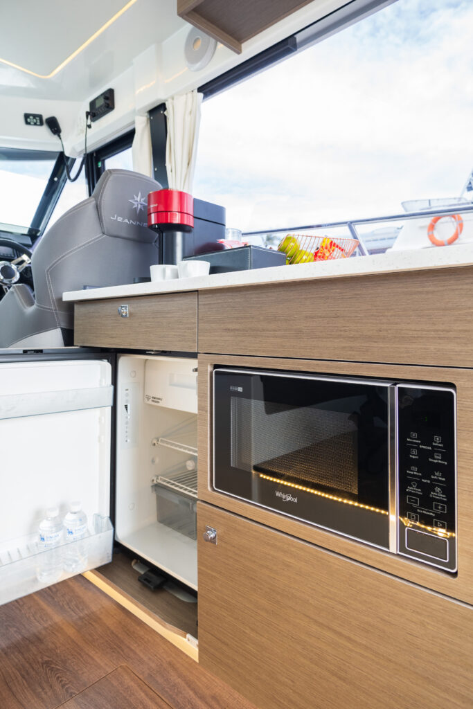 Effortless Access: Features recessed side decks, a starboard sliding helm door, and an opening coaming gate for safe movement at sea.