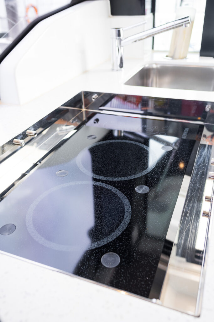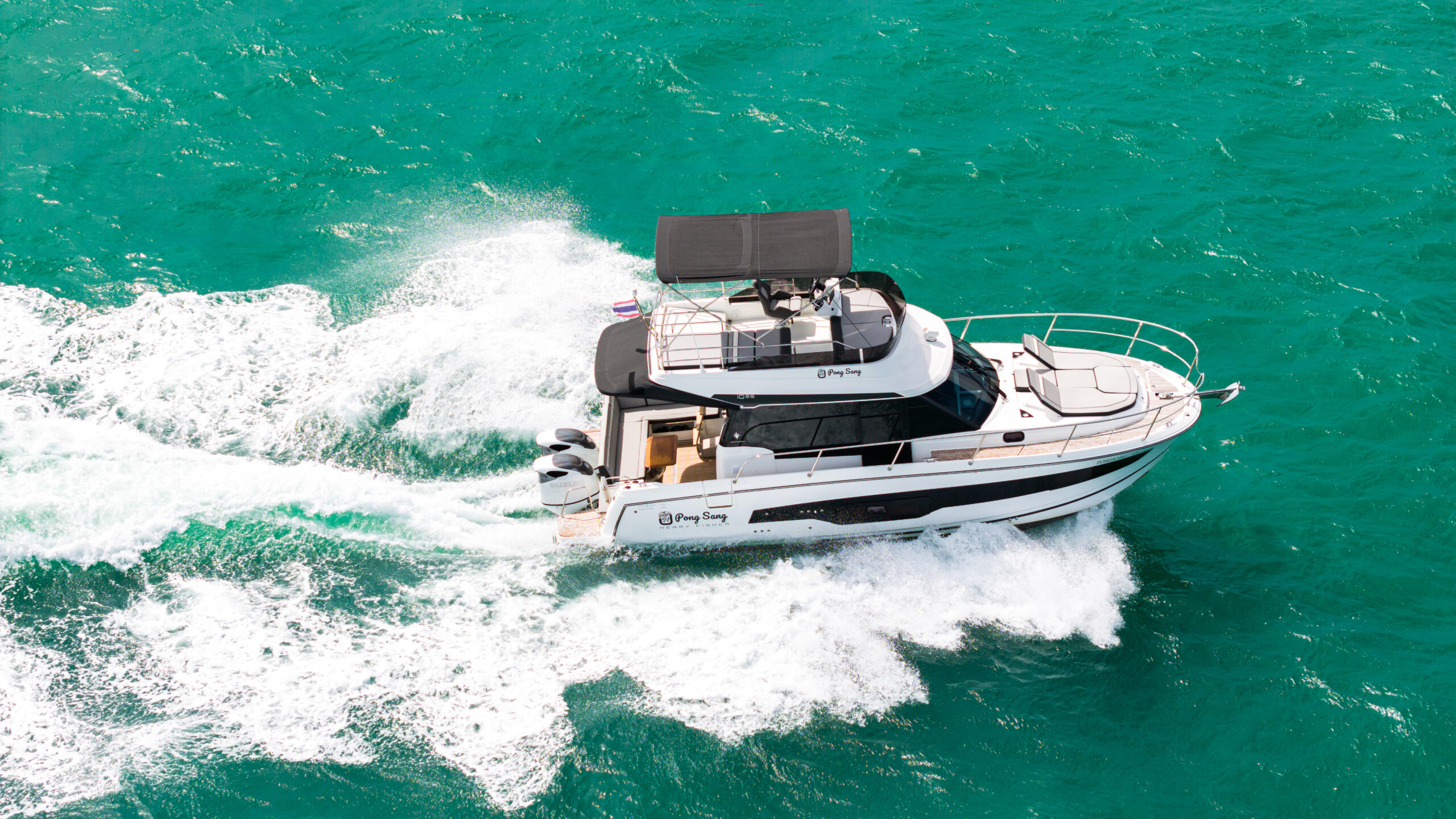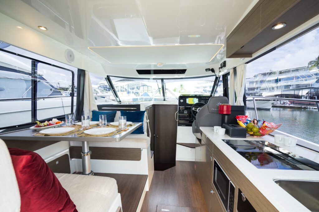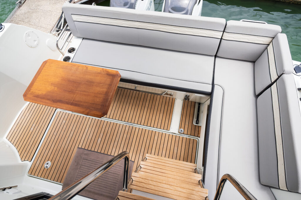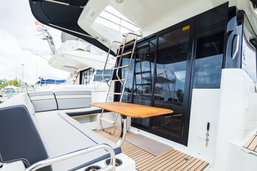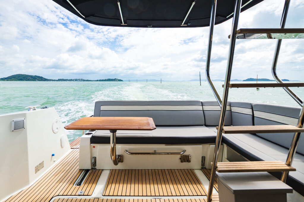 Modular Cockpit: The aft deck offers flexible seating and deep underfloor storage, while sliding glass doors merge the interior and exterior into one social space.