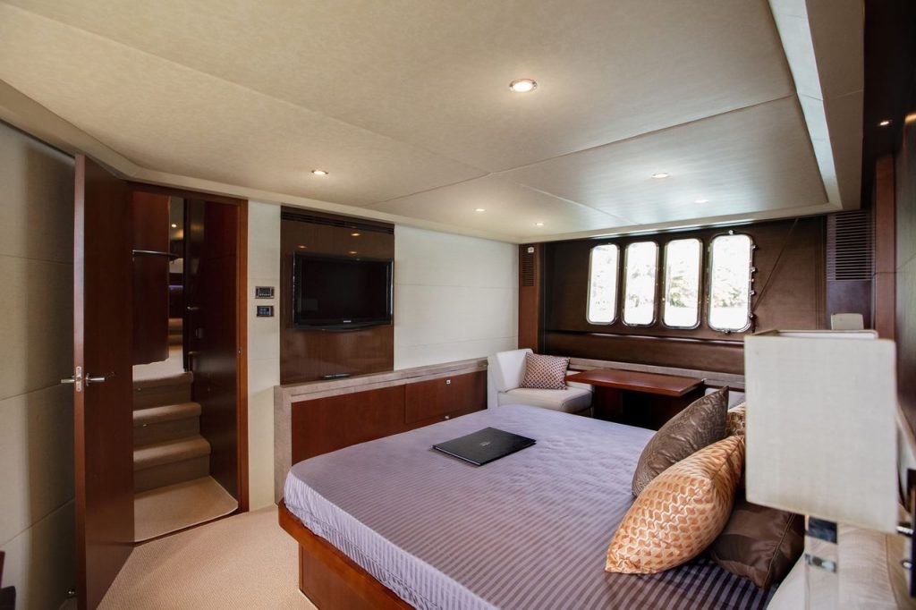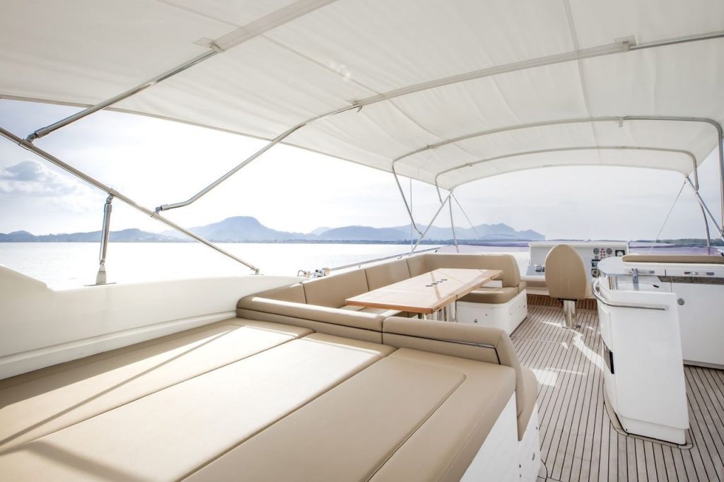 Sleek lines and totally turned to charterer comfort she embodies the brand design and technology, delivering thoroughbred performance and an assured, stable ride for effortlessly fast and efficient cruising. The fly bridge itself is expansive and incorporates a single deck level, allowing for the option of a large wet bar with relaxed seating area and sunbed arrangement. The main deck accommodates a broad and sumptuous saloon area through the generous beam.