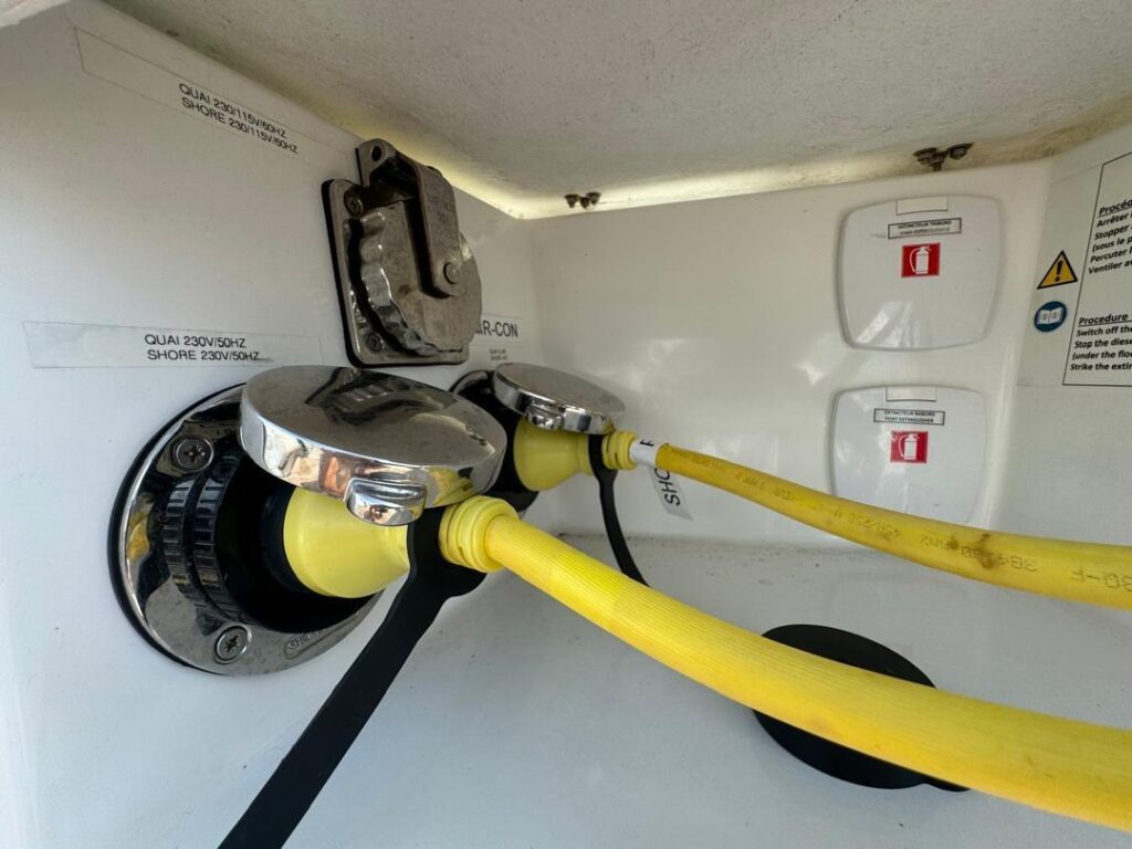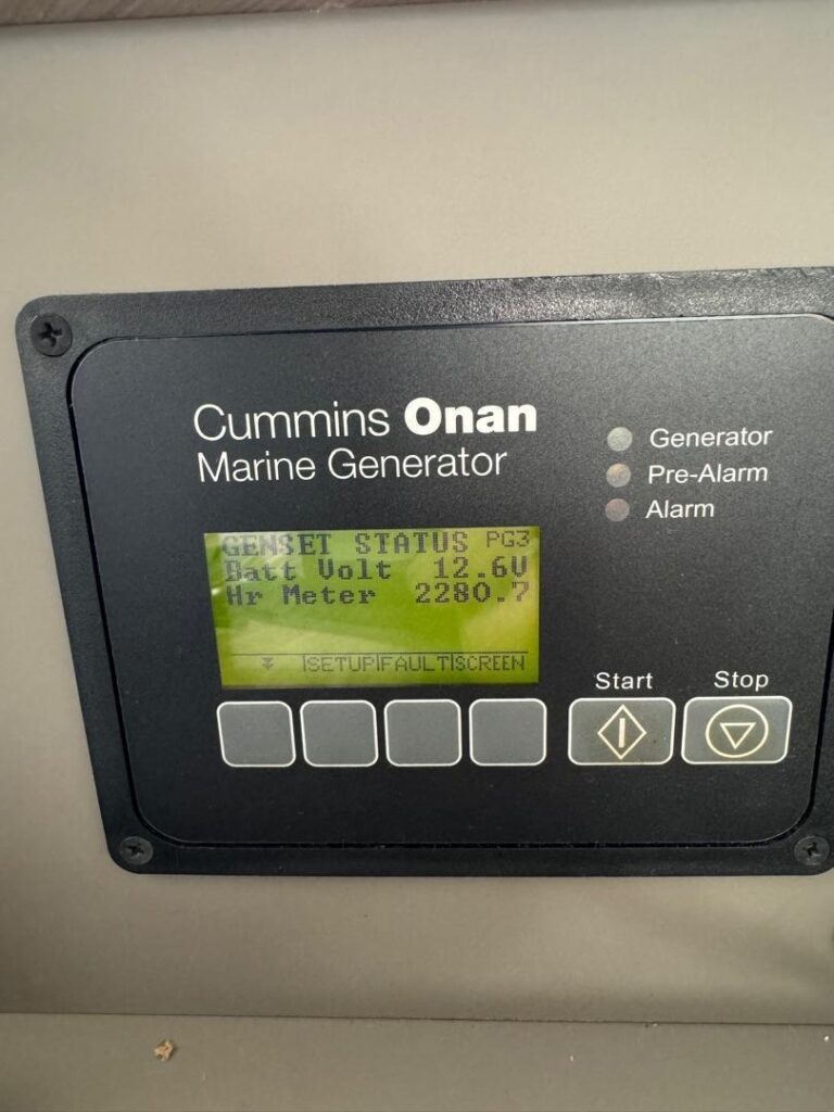 Generator: ONAN 17 kw (approx 2200 hrs) Inverter Shore power inlet Solar panel (7400 watts !) 8 x lithium ion phosphate batteries (24 VDC - 200 amps) This boat can operate 100% self powered but not full A/C
