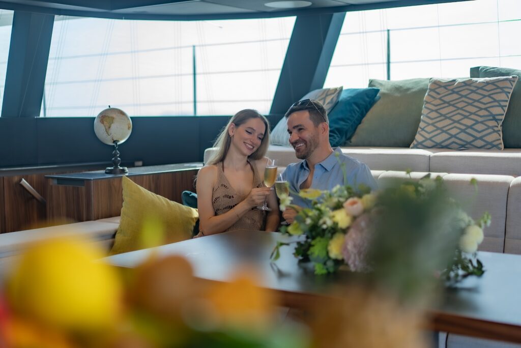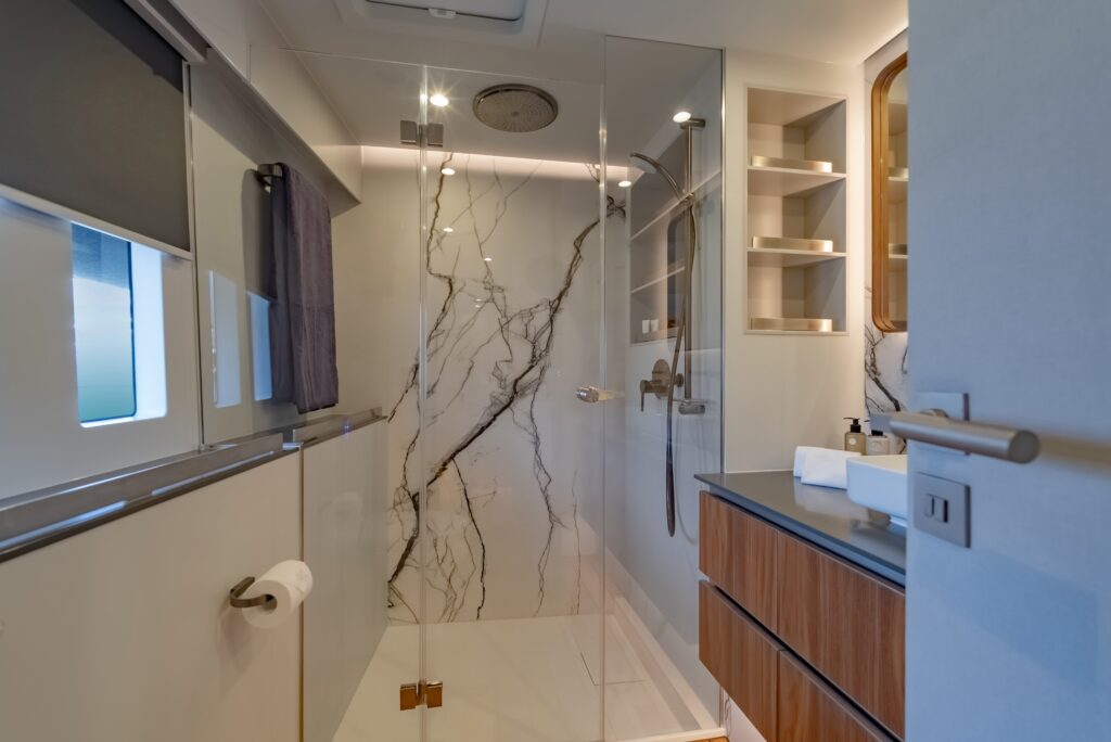 The outdoor space on E-MOTION is impressive. Guests can unwind in style with plush lounging areas on both the foredeck and flybridge. At the rear, you’ll find an inviting open-air dining space perfect for enjoying meals with a view, along with a large hydraulic swim platform that makes dipping into the sea effortless.