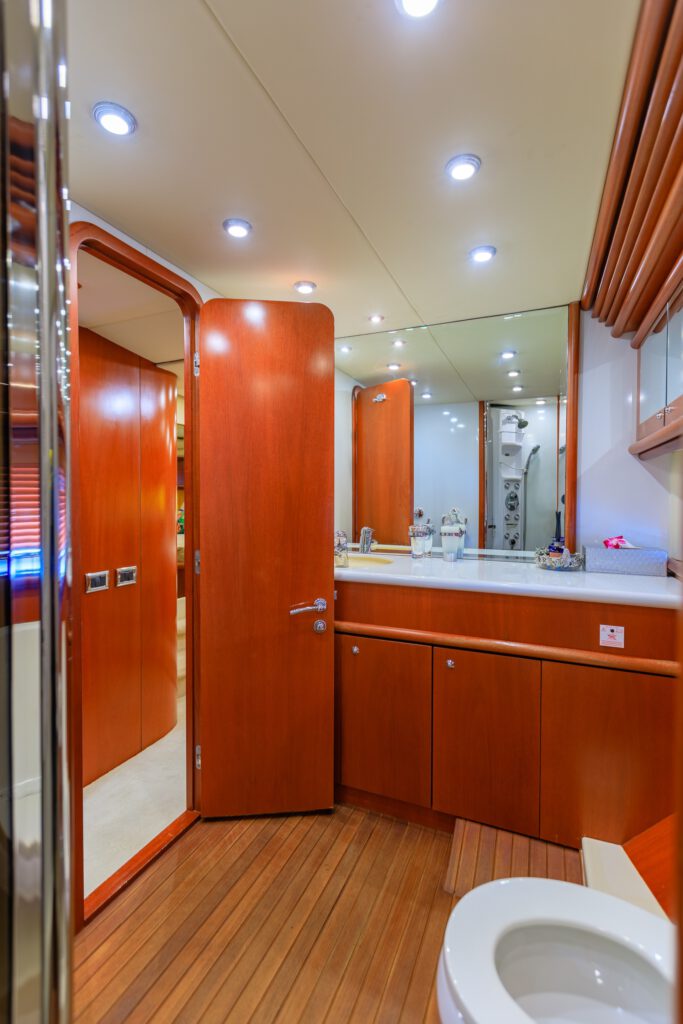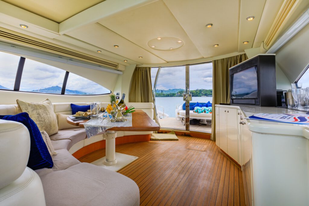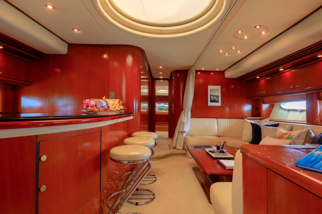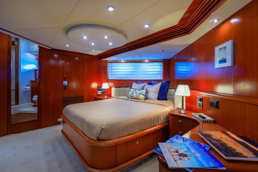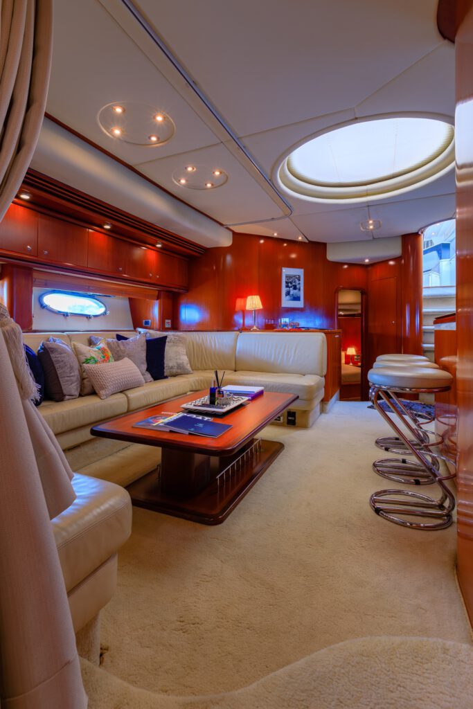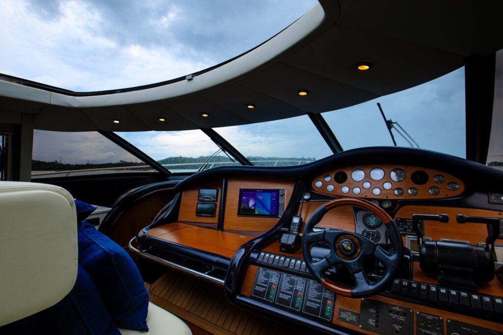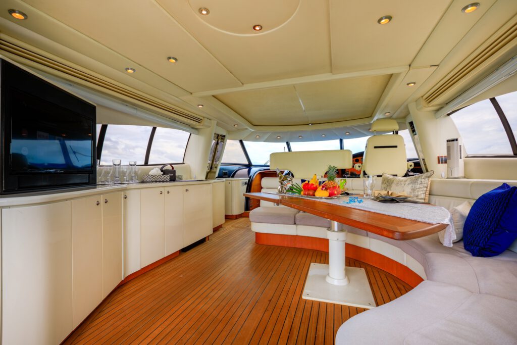 The Predator 80 features full air conditioning throughout. There is a wide range of interior options available, or the owner may submit an original design. The standard features include hydraulic power steering, bow and stern thrusters, and comprehensive navigational equipment. The automatically-opening hardtop reveals a fixed dining table and comfortable seating for eight.